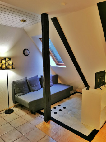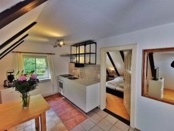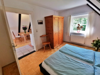 Die gemütliche Ferienwohnung Aron für zwei Personen liegt im Giebel des Gästehauses Ruschmeyer-Haus mit Blick auf den Hausgarten und das dahinter liegende Waldstück. Schräg gegenüber auf der anderen Seite der kleinen Waldstraße liegt eine unserer Schulpferde-Weiden.