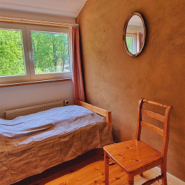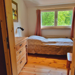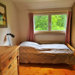 Im großen Schlafzimmer (Elternschlafzimmer) steht ein 160ger Bett mit zwei 80ger Matratzen. Dieses Zimmer hat einen Einbauregal als Kleiderschrank. Das zweite Schlafzimmer (Kinderzimmer) hat ein ausziehbares Bett, sodass es als Einzelbett sowie auch als Doppelbett (dann 160 breit) genutzt werden kann. Im dritten Schlafzimmer (Kinderzimmer) steht ein Einzelbett von 90ger Breite und eine alte Bauernkommode. Alle Schlafzimmer sind mit jeweils einem Stuhl und Spiegel ausgestattet.