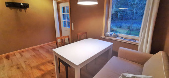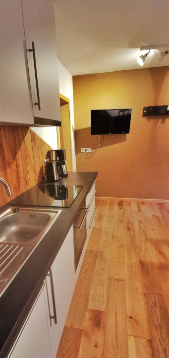 Offener Küchen-Wohnbereich mit Essplatz, Sofaecke und kleinem Flur