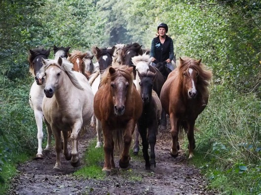 Unsere Reiterurlauber halfen beim Absperren der Straße. Annika Pitzer führt die Herde auf die neue Weidefläche. Auf dem letzten Streckenabschnitt lässt sich Annika immer verabredet von den Pferden überholen, damit die Zuchtpferde-Herde ins Bild läuft.
