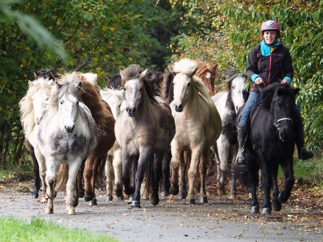 Am 22. Oktober bringt Annika Pitzer mit der routinierten Islandstute Kráka die große Stuten- und Fohlenherde auf eine neue Fläche. Normaler Weise grast die Herde bereits im September diese Fläche ab, vielfach bekannt aus den Fotostrecken vom Septemberspaziergang in jedem Jahr. In diesem Jahr ist es aufgrund der ausgezeichneten Weidesituation schon fast Ende Oktober, als die Herde auf ihrer Herbstfläche ankommt. Mit Klick auf das Foto können Sie die anderen Fotos aus der Serie sehen.
