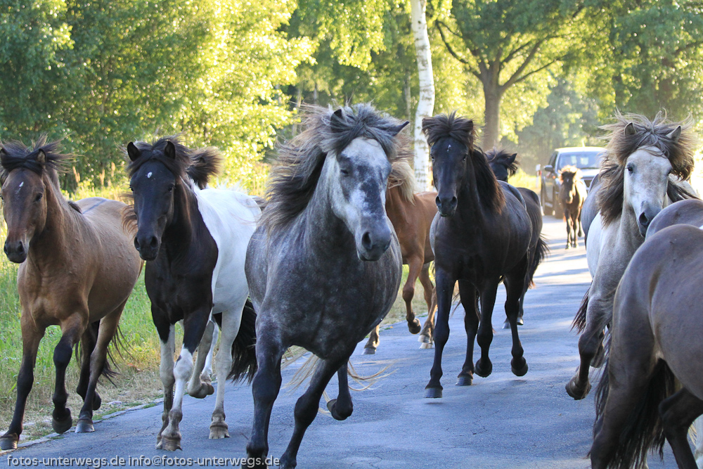 Am Abend, nach dem gemeinsamen Ausritt mit den Reiturlaubs-Gästen sperrte Hannes die Nebenwege ab. Um die Abendbrots-Zeit ist auf unserer Landstraße fast kein Fahrzeugverkehr. Hinter bzw. vor den Weideausgängen achteten einige Reiter darauf, dass die Herde nicht in die falsche Richtung läuft und bildeten eine Kette auf der Straße.